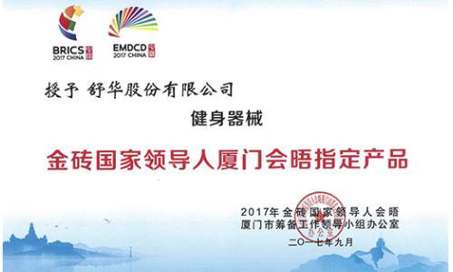 2017年,ug环球健身器材入驻厦门金砖国家领导人会晤,并成为厦门金砖会晤指定健身器械。X6豪华智能家用跑步机荣获中国好设计金奖。 2017, Shuhua fitenss equipment presented itself in Xiamen as the designated fitness equipmentof Xiamen BRICS summit. X6 luxurious home use treadmill won gold award of China Good Design.